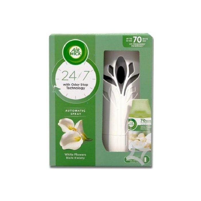 Air Wick Freshmatic Original Biele kvety Frezie 250ml. Zachytáva ľahkú vôňu čerstvo narezaných bielych kvetov, frézie a francúzskeho jazmínu (až do konca s nádychom zeleného jablka). Vyberte si z troch nastavení pre dosiahnutie požadovanej intenzity vône. Vymeniteľná vôňa. Vrátane 2 AA batérie. Zaveste na stenu, alebo položte na poličku alebo skriňu.