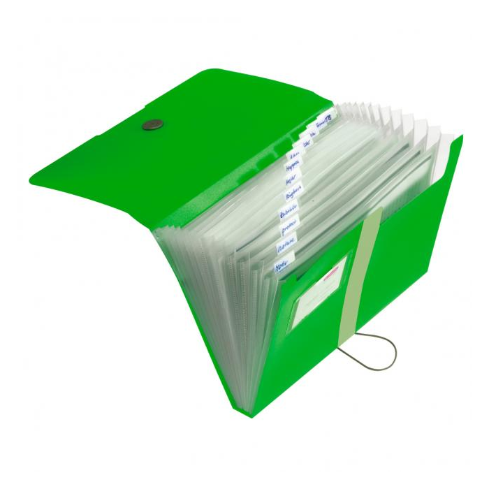 Plastová aktovka produktového radu Easy Orga s 12 plastovými priehradkami s indexami a malou priehradkou vizitkového formátu. Kapacita 300 listov. Uzatváranie gumičkou o plastový krúžok. Väčšie balenie 10 ks. Farba jablkovo zelená.