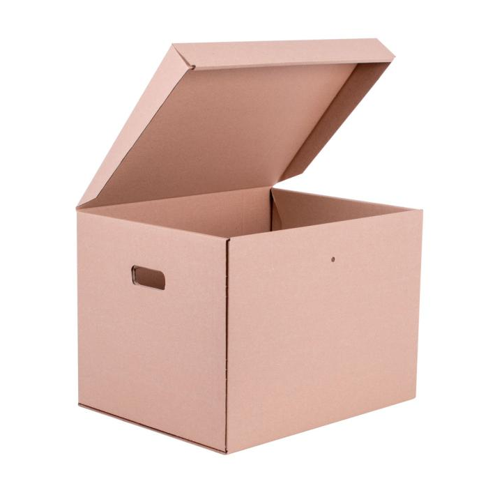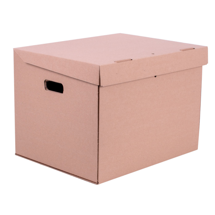 Hnedá papierová krabica s vekom na zakladače.