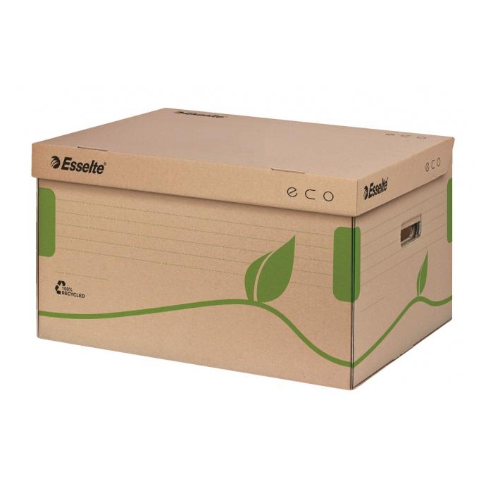 Krabica z archivačného systému Esselte ECO navrhnutá so zeleným prístupom. 100% recyklovateľná s 85% podielom spotrebiteľského odpadu, certifikovaná FSC. Veľkosť optimalizovaná iba na papiere A4 s cieľom minimalizovať odpad pri výrobe.