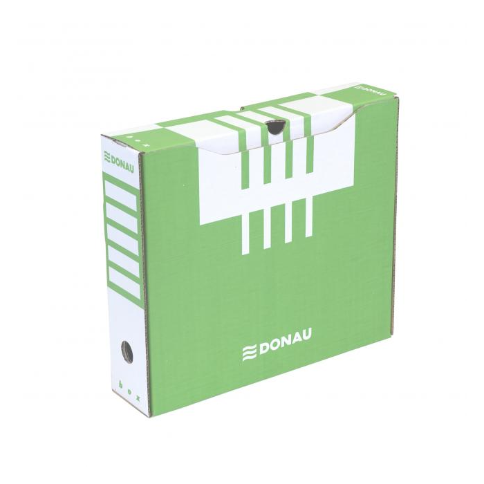 Archívny box z trojvrstvovej lepenky s certifikátom FSC® (drevo na jej výrobu pochádza z lesov, obhospodarovaných udržateľným spôsobom), bez obsahu kyseliny (pH 7,5). Vhodný na archiváciu dokumentov do formátu A4 s otvorom na ľahkú manipuláciu. Možnosť archivovať aj zakladač Donau. Predtlače na popis na dlhšej i kratšej strane umožňuje skladovanie vo vodorovnej aj zvislej polohe. Box je využiteľný samostatne alebo v kombinácii s archivačnými krabicami. Gramáž 390 g. Rozmery 297x80x339mm. Väčšie balenie 20 ks.