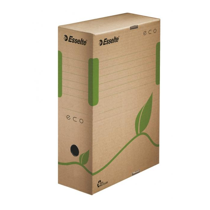 Box z archivačného systému Esselte ECO navrhnutý so zeleným prístupom. 100% recyklovateľný s 85% podielom spotrebiteľského odpadu, certifikovaný FSC. Veľkosť optimalizovaná iba na papiere A4 s cieľom minimalizovať odpad pri výrobe.