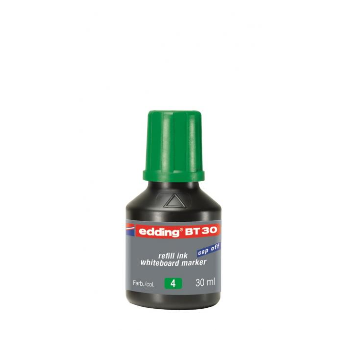 Atrament slabého zápachu vo fľaštičke s kvapkovým dávkovačom na dopĺňanie popisovačov edding 250, 361 a 365, určených na biele tabule. Tento chemický prípravok je nebezpečný. Obsah fľaštičky 30 ml. Farba: zelená