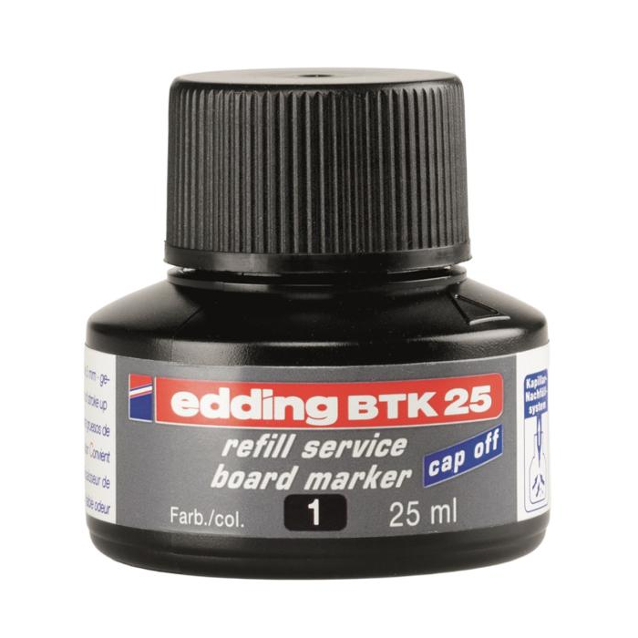 Atrament slabého zápachu s kapilárnym systémom na dopĺňanie popisovačov edding 250, 360, 361 a 363, určených na biele tabule. Tento chemický prípravok je nebezpečný. Obsah fľaštičky 25 ml.Pri doĺňaní vložte prednú časť popisovača špičkou do fľaštičky a po niekoľkých minútach bude popisovač pripravený k opätovnému použitiu.