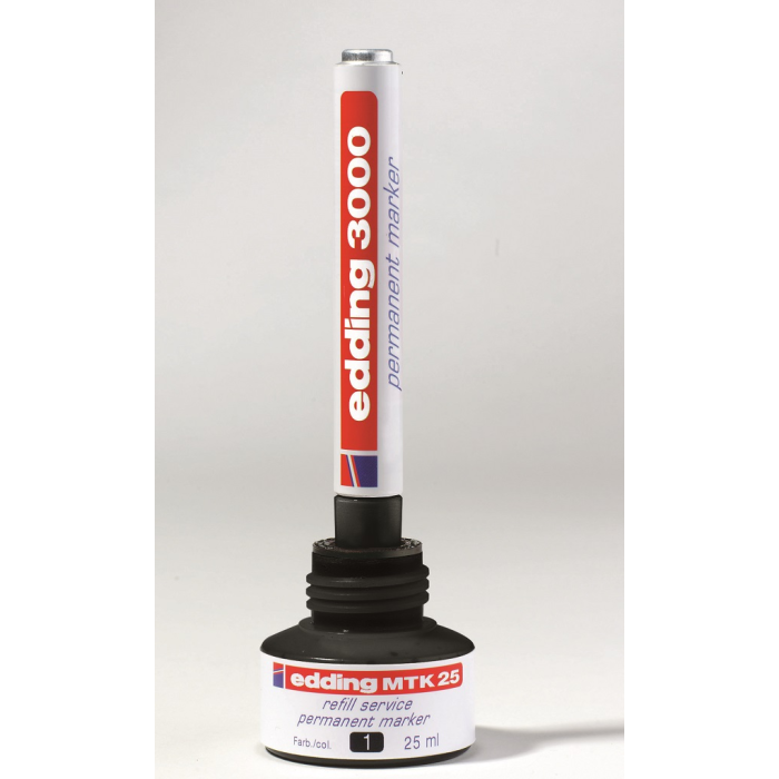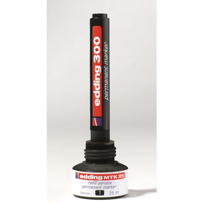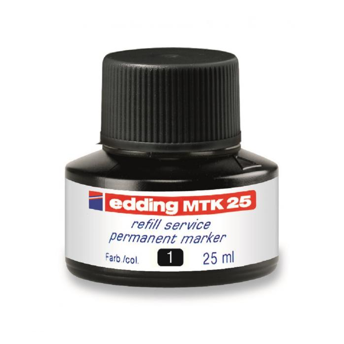 Atrament slabého zápachu s kapilárnym systémom na dopĺňanie permanentných popisovačov edding 2000/-2000 C, 2200/-2200 C, 400, 300, 330 a 370. Obsah 25 ml. Tento chemický prípravok je nebezpečný. Pri dopĺňaní vložte prednú časť popisovača špičkou do fľaštičky a po niekoľkých minútach bude popisovač pripravený k opätovnému použitiu. Obsah 25 ml.