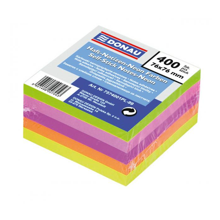 Samolepiace bločky v tvare kocky. Kocku je možné „otvoriť“ a odobrať ktorýkoľvek lístok bez toho, aby sa rozlepila. 5 neónových farieb (zelená, žltá, ružová, oranžová a červená) po 80 lístkov. Rozmer 76 x 76 mm.