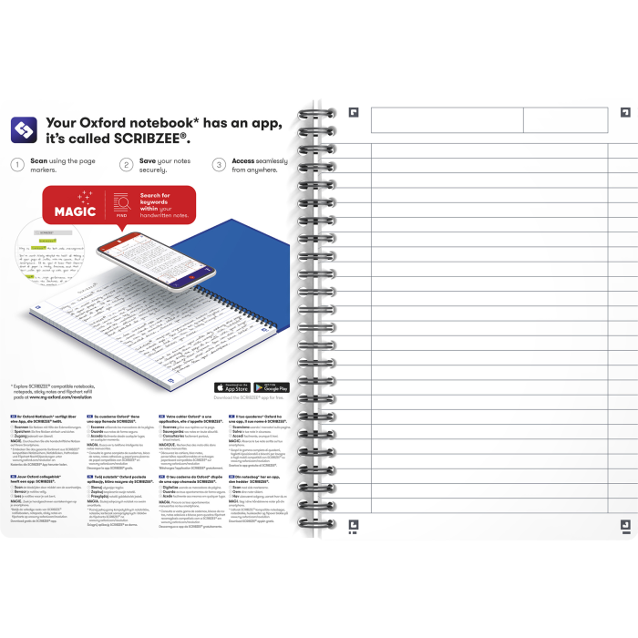 Blok s dvojitou špirálou, ktorá zabezpečuje otváranie strán o 360 °. Kompatibilný so SCRIBZEE. Listy s dierovaním, 6 mm linkovanie so záhlavím. Dosky z mäkkého, odolného laminovaného kartónu. Extra jemný a hladký papier Optik gramáže 90 g/m², u ktorého nedochádza k presakovaniu atramentu na druhú stranu. Vnútorné a vonkajšie okraje. Dodávané v mixe farieb. Formát A5. 90 listov. Úprava linajková.