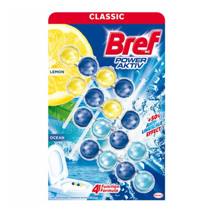 Bref Power Aktív WC blok s vôňou citrónu & oceánu a o plus 50% vyšším účinkom proti vodnému kameňu. Hľadáte jednoduchší spôsob, ako udržať vašu toaletu čistú a sviežu? Bref WC blok je jednoduchým a pohodlným spôsobom, ktorý zaisťuje čistotu a sviežosť vo vašej toalete od prvého do posledného spláchnutia. Bref Power Aktív WC blok má zloženie so 4 funkciami: - Čistiaca pena čistí toaletu s každým spláchnutím. - Ochrana pred vodným kameňom zabraňuje tvorbe vodného kameňa v toalete. - Ochrana pred nečistotami zabraňuje ich usadzovaniu. - Extra sviežosť zanecháva dlhotrvajúcu sviežu vôňu v kúpeľni. - Blok 4 x 50g