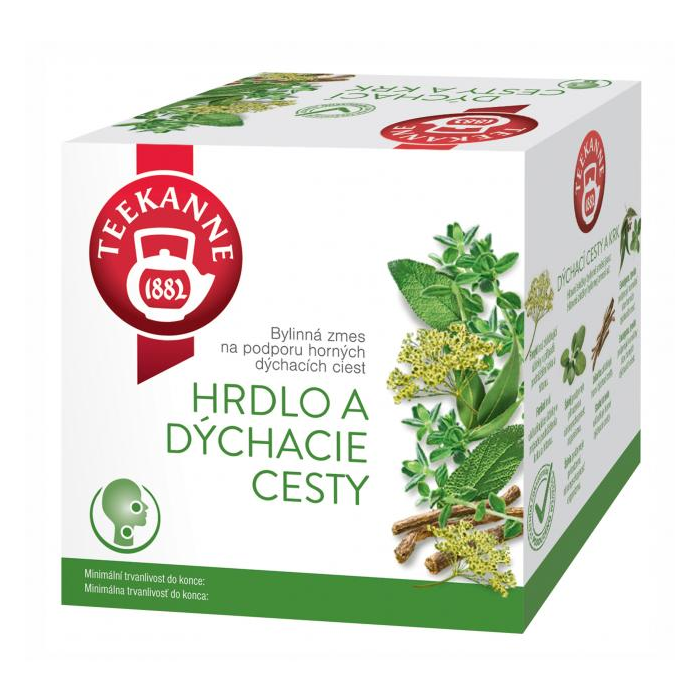 Liečivý bylinný čaj Teekanne na hrdlo a dýchacie cesty. Balenie 10 x 2 g. Hlavné zložky bylinného čaju sú: Fenikel má ukľudňujúce účinky v prípade podráždenia krku a hltanu.Šalvia podporuje prirodzenú obranyschopnosť organizmu. Sladké drievko ukľudňuje horné dýchacie cesty. Eukalyptus, tymián podporujú normálny stav horných dýchacích ciest. Bylinná zmes vhodná v období častých prechladnutí.