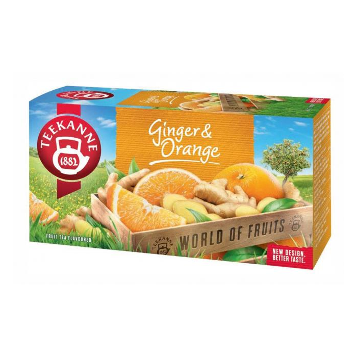 Ovocno-bylinný čaj Teekanne je kombináciou pomarančovej sviežosti a korenistej chuti zázvoru. V balení 20 x 2,25 g.