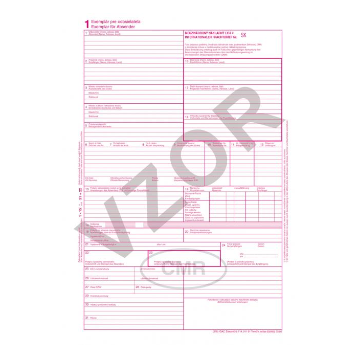 Evidenčné a colné tlačivá. CMR, 7 listov, balenie 100 súprav. Samoprepis.