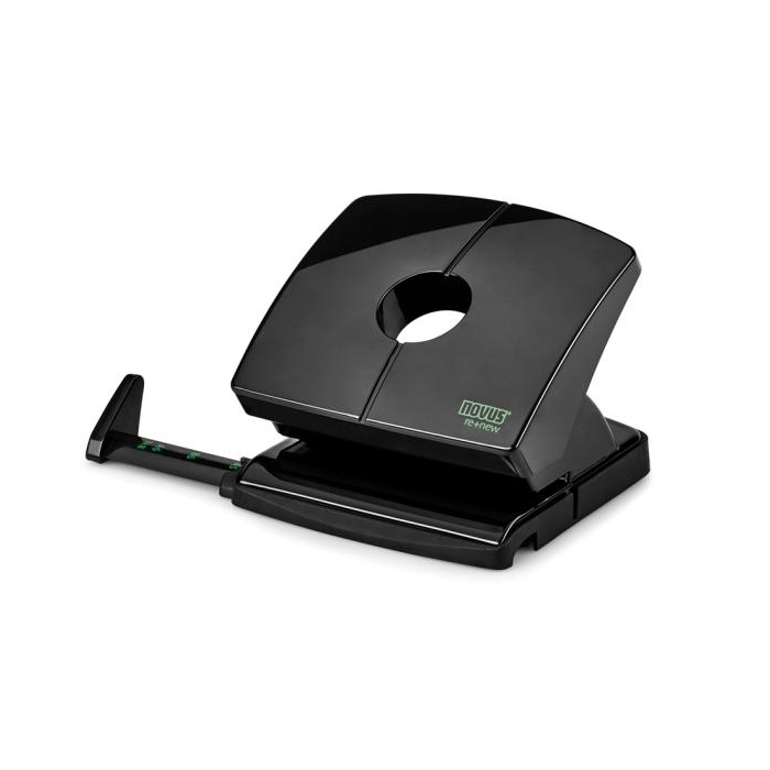 Dierovačka s kovovou základňou pre profesionálne použitie z kolekcie šetrnej k životnému prostrediu re+new, s vrchnou časťou zo 64% recyklovaného plastu a posuvným pravítkom vo farbách a dizajne zhodnom so zošívačkou B 2 re+new. Rozpätie dier 8 cm, priemer dier 5,5 mm. Hmotnosť 350 g. Záruka 10 rokov. Kapacita dierovania 20 listov. Farba čierna.