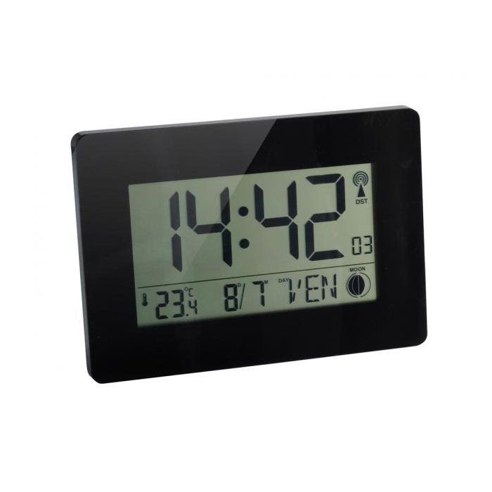 Hodiny v čiernej lakovanej úprave s výbornou čitateľnosťou. Riadené rádiovým signálom DCF s automatickým nastavením času a dátumu podľa najpresnejších hodín sveta a automatickou zmenou letného a zimného času. Digitálne zobrazenie času vo formáte 12 / 24 hodín, dátum (deň, mesiac), meranie vnútornej teploty, zobrazovanie je na výber zo 7 jazykov (anglický, nemecký, francúzsky, taliansky, dánsky, španielsky, holandský). Rozmery 229 × 162 mm, hrúbka 27 mm. Možnosť postaviť na stôl alebo zavesiť na stenu. Súčasťou balenia sú 2 batérie AA. Farba čierna.
