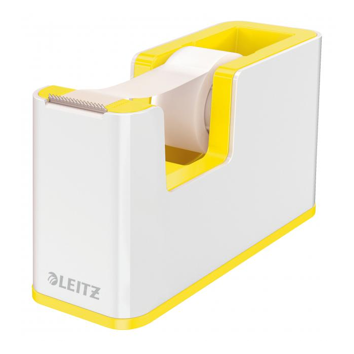 Atraktívny dispenzor s lepiacou páskou v dvojfarebnom prevedení v metalických farbách Leitz WOW s lesklým povrchom. V praktickom dizajne na pohodlné ovládanie jednou rukou. Farba žltá. Pre kotúčiky pások do veľkosti 19 mm × 33 mm.