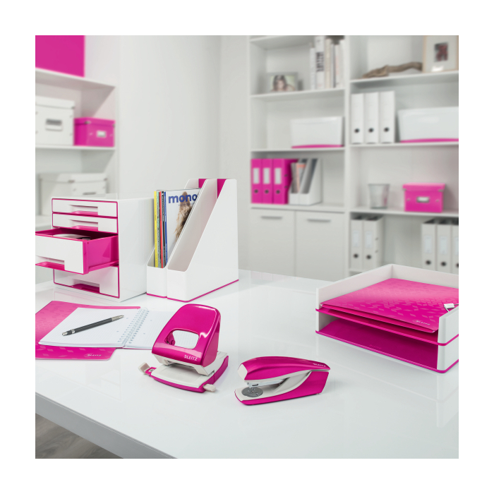 Elektrická zošívačka Leitz New NeXXt WOW. Vďaka jednoduchému ovládaniu jednou rukou je ideálna na časté používanie. Technológia s napájaním na batérie na zošívanie v pohybe. V žiarivých farbách WOW. Batérie (4× 1,5 V AAA LR03) nie sú súčasťou balenia. Kapacita 10 listov. Náhradné spinky ES556800. Farba ružová.