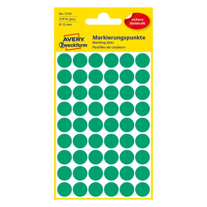 Kruhové etikety na ručný popis. Priemer 12 mm, v balení 270 etikiet. Farba zelená.