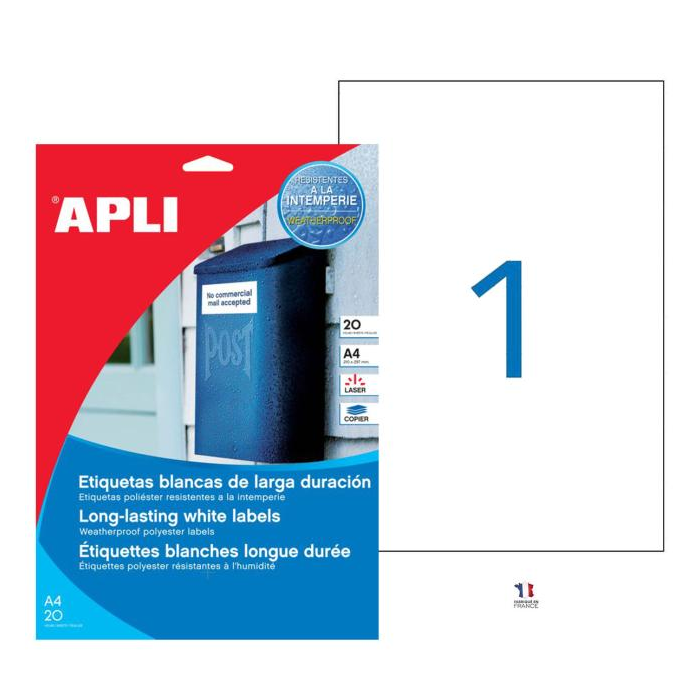 Biele etikety so štvorcovými rohmi, rozmer 210,0 x 297,0 mm s permanentným lepidlom. Balenie s 20 hárkami (20 štítkov). Etikety s bielym polyesterovým matným povrchom, odolné voči poveternostným vplyvom a vplyvom prostredia. Tieto polyesterové etikety odolávajú extrémnym podmienkam, teplotám od -20°C do +100°C. Ideálne na označovanie vonkajších prvkov a značiek, ako aj balíkov. Vynikajúca kvalita pri použití laserových tlačiarní aj kopírok.