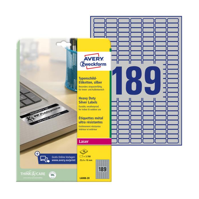 Veľmi odolné polyesterové etikety odolné voči oleju, prachu, špine, natrhnutiu, vode. Odolávajú teplotám od −40 ° do + 150 °C. Určené pre tlač v laserových tlačiarňach. Vhodné aj pre vonkajšie použitie. Rozmery v mm : 25,4 × 10. Farba strieborná. Etikety na hárku 189 kusov. Balenie 20 hárkov.