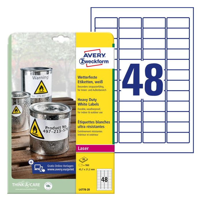 Etikety polyesterové veľmi odolné 45,7x21,2mm Avery A4 biele 20 hárkov