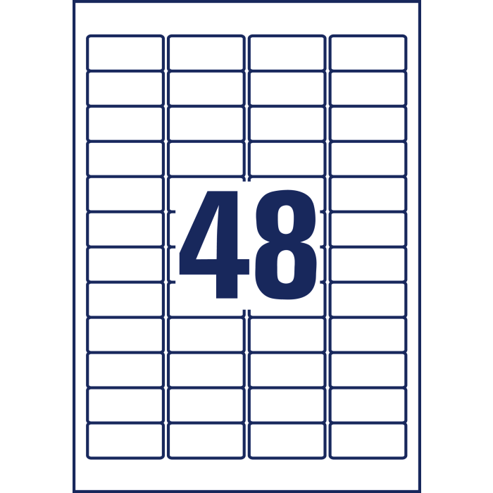 Rozmery v mm : 45,7 × 21,2. Farba biela. Etikety na hárku 48 kusov. Balenie 20 hárkov.