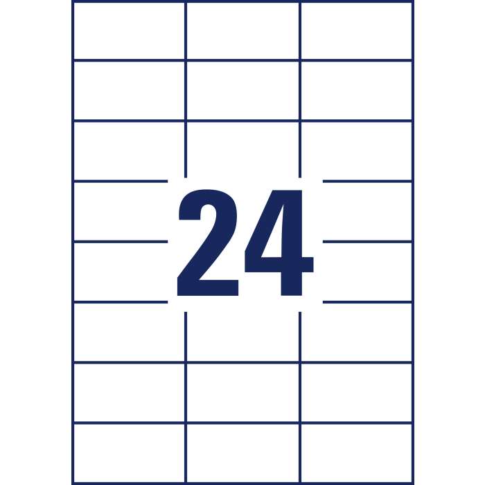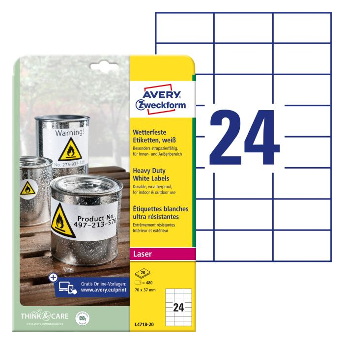 Veľmi odolné polyesterové etikety odolné voči oleju, prachu, špine, natrhnutiu, vode. Odolné voči teplotám od -20° do +80°C. Sú určené pre tlač v laserových tlačiarňach a sú vhodné aj pre vonkajšie použitie. Rozmery v mm : 70 × 37. Farba biela. Etikety na hárku 24 kusov. Balenie 20 hárkov.