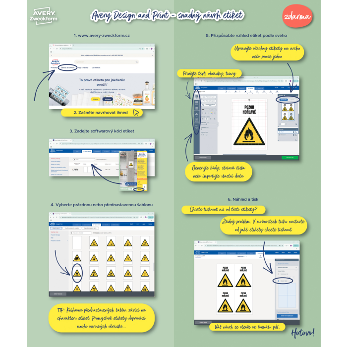 a certifi kované TÜV SÜD. Vysoká lepivosť na rôznych povrchoch. Ostrá tlač bez bez rozmazávania. Etikety sú vyrobené spôsobom šetrným k životnému prostrediu, majú certifi káciu FSC®, sú bielené bez použitia chlóru. Šablóny a softvér pre jednoduchú a rýchlu tlač etikiet k dispozícii zdarma. Formát A4. Balenie 25 + 5 hárkov.
