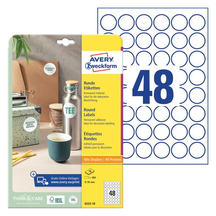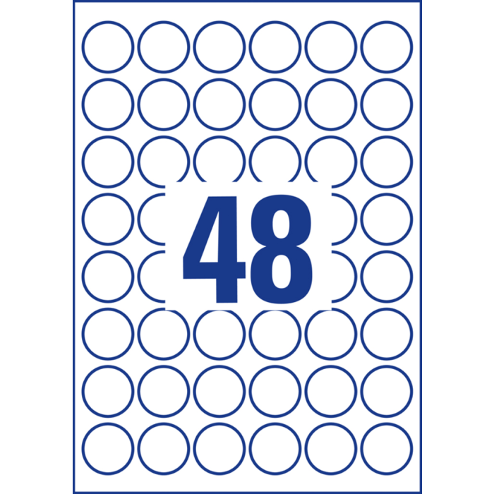 Biele kruhové univerzálne etikety vhodné na každodenné použitie v atramentových a laserových tlačiarňach a kopírovacích strojoch. Ostrá tlač bez bez rozmazávania. Etikety su vyrobené spôsobom šetrným k životnému prostrediu, majú certifikáciu FSCR, sú bielené bez použitia chlóru. Šablóny a softvér pre jednoduchú a rýchlu tlač etikiet k dispozícii zdarma. Formát A4. Balenie 10 hárkov. Priemer 30 mm.