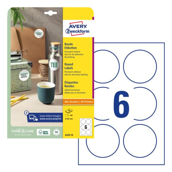 Biele kruhové univerzálne etikety vhodné na každodenné použitie v atramentových a laserových tlačiarňach a kopírovacích strojoch. Ostrá tlač bez bez rozmazávania. Etikety su vyrobené spôsobom šetrným k životnému prostrediu, majú certifikáciu FSCR, sú bielené bez použitia chlóru. Šablóny a softvér pre jednoduchú a rýchlu tlač etikiet k dispozícii zdarma. Formát A4. Balenie 10 hárkov. Priemer 80 mm.