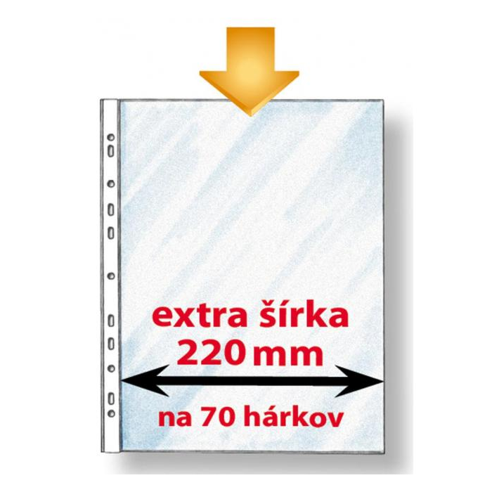 Obal s eurodierovaním vhodný na zakladanie materiálov rozšíreného formátu A4. Povrch matný, otvor zhora. Hrúbka 50 mic. Vnútorné rozmery obalu 305 × 220 mm. Balenie 50 ks v PE sáčku. Formát: A4 maxi Hrúbka: 50 mik.