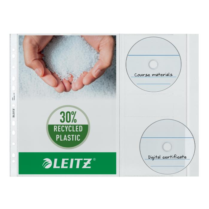 Závesné plastové obaly pre archiváciu dokumentov a zároveň podkladov na CD/DVD v pákových a krúžkových zoraďovačoch. Praktický typ špeciálneho euroobalu formátu A4 s multiperforáciou a 2 vreckami s chlopňou na bezpečné uloženie na CD. CD vkladané z boku. Hrúbka 120 um. Balenie 5 ks. Embosovaná PP fólia 0,13 mm.