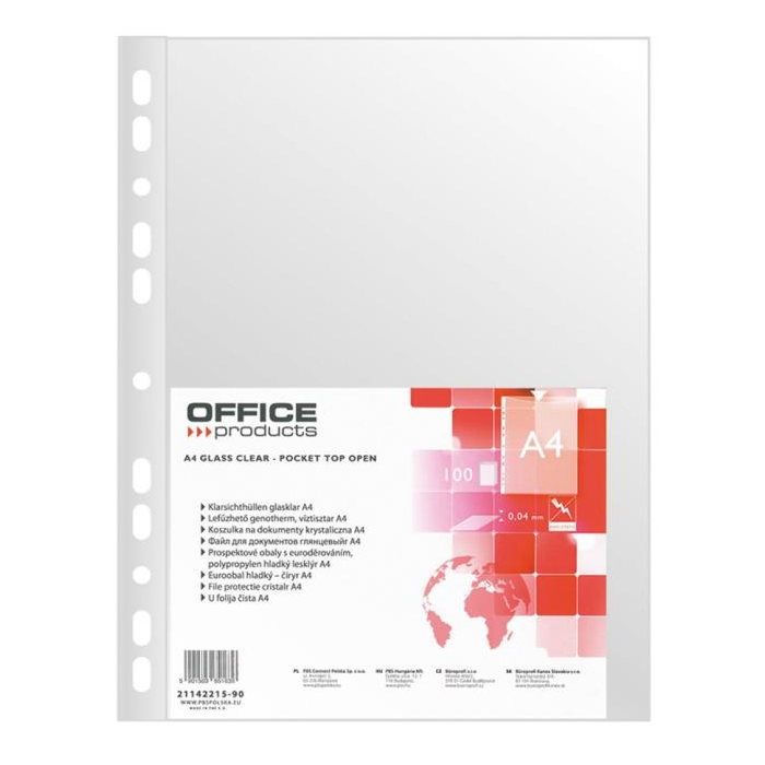 Priehľadný číry euroobal z polypropylénu. Otvor zhora, eurodierovanie, povrch lesklý a hladký. Formát A4. Balenie 100 ks. Balený v sáčku.