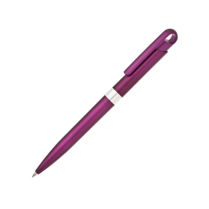 Plastové guľôčkové pero FIROL v metalických farbách. Uprostred pera je stieborný krúžok. Modrá náplň veľkoobjemová. Kolekcia DESIGN. Farba fialová.