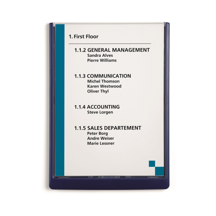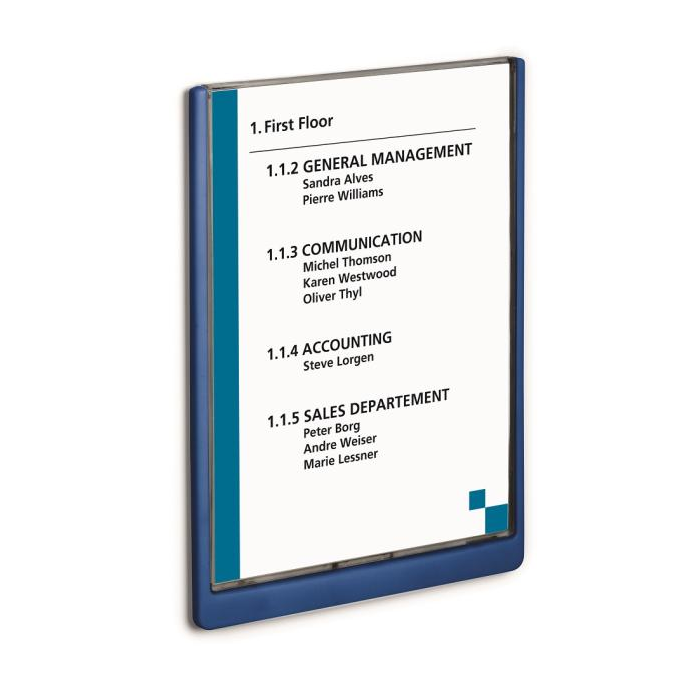 Moderná informačná tabuľka na dvere s lemom v atraktívnej modrej farbe. Predný panel sa otvára na jedno zatlačenie, a tým sa jednoducho sprístupnia vložené popisné papiere, ktoré sa môžu vymieňať podľa potrieb. Tabuľka je ideálna do kancelárií, úradov, škôl, univerzít a hotelov. Súčasťou balenia je montážna sada s názorným návodom. Namiesto pevného montovania môže byť tabuľka k povrchu aj prilepená.
