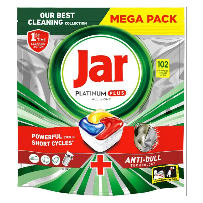 Najlepší prostriedok z kolekcie Jar na umývanie odolných zvyškov jedla, ktorý zanecháva vaše riady čisté ako nové Vďaka technológii Anti-dull odstraňuje matnosť a obnovuje pôvodný lesk vášho riadu Účinné aj pri krátkych cykloch Prepnite na krátke cykly a ušetrite čas, energiu a vodu v porovnaní s bežnými cyklami Vďaka zabudovanému systému predbežného umývania nemusíte riad vopred umývať vy a dokonca vám pomáha šetriť vodu Odporúčané výrobcami umývačiek riadu na celom svete Zabudovaná pomocná funkcia soli a leštidla vrátane ochrany skla a striebra Náš závod využíva a kupuje 100 % obnoviteľnú elektrickú energiu