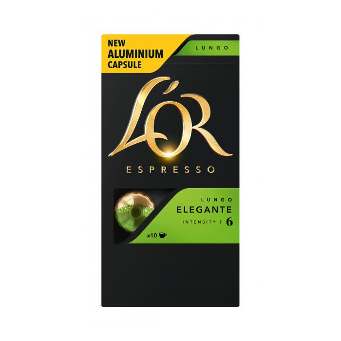 L'OR Espresso Elegante Intenzita 6/14. Starostlivo vytvorené L´or Espresso Elegante očarí Vaše zmysly výraznou osobitosťou a silnou korenistou vôňou. Jedná sa o ideálu zmes pre espresso lungo, ktorá Vás sprevádza na nezabudnuteľnej ceste k dokonalému zážitku z kávy. Chuť: silná-výrazná-ideálna. Tieto kapsule sú vhodné do kávovaru Nespresso. Balenie obsahuje 10 kapsúl 52 g.