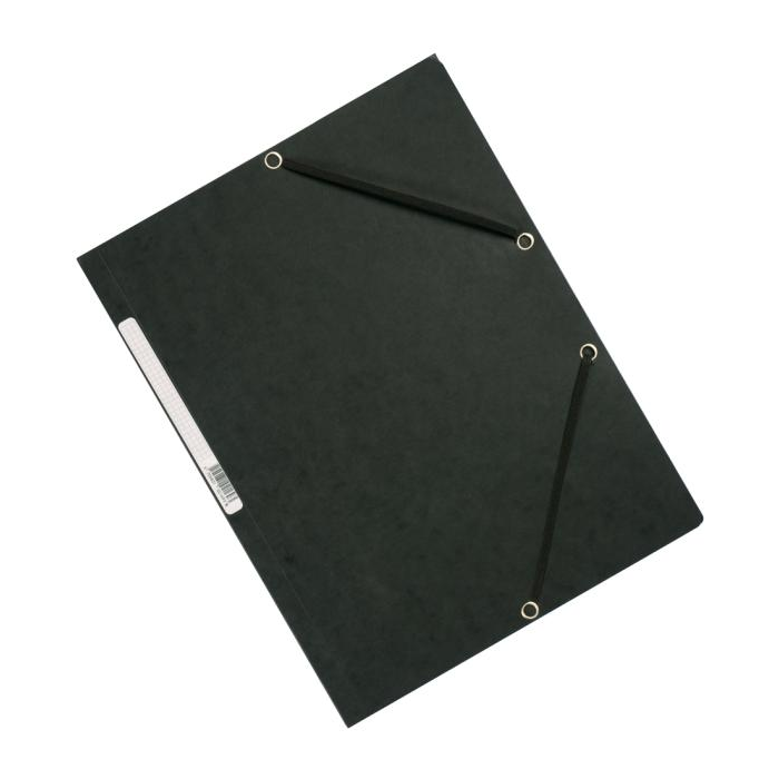 Obal s tromi chlopňami a gumičkou z kvalitného hladkého kartónu gramáže 375 g. Chrbtový štítok, kapacita 200 listov. Farba čierna.