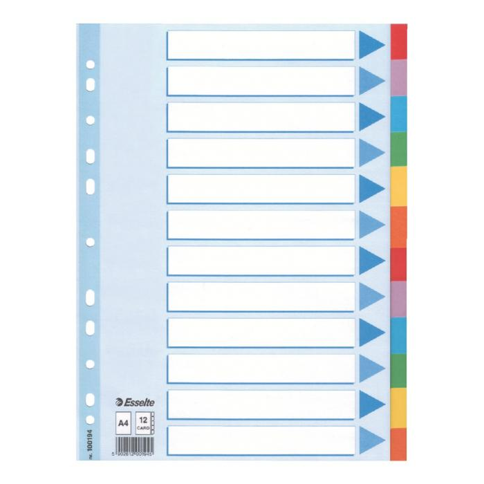 Celofarebný rozraďovač Esselte vyrobený z kartónu v rôznych farbách. Formát A4, eurodierovanie, popisovateľný titulný list na jasnú identifikáciu obsahu. Balenie jedna sada v polyesterovom sáčku. Väčšie balenie 10 sád. Formát: A4 Popis: s titulným listom