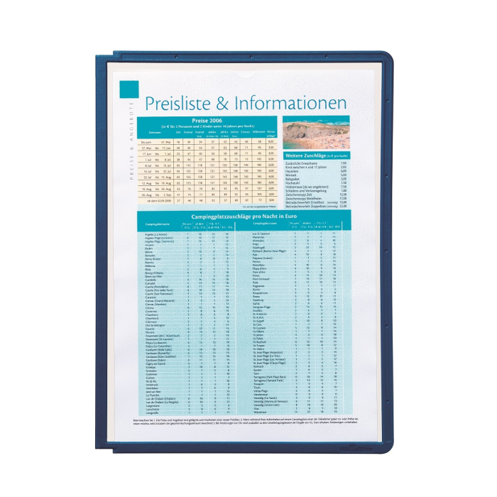 Displejový panel vyrobený z matného antireflexného polypropylénu pre systém Sherpa, kovové držiaky a rotačný stojan. Vložený materiál je kopírovateľný a skenovateľný. Pevný farebný rám s pozíciami pre indexy. Formát A4. Balenie 5 ks. Farba rámu: tmavomodrá Popis: pozície pre indexy