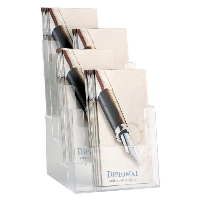 Stojan na prospekty formátu A5 so štyrmi oddielmi. Materiál priehľadný číry plast. Rozmery (š x v x h) 165 x 260 x 155 mm.