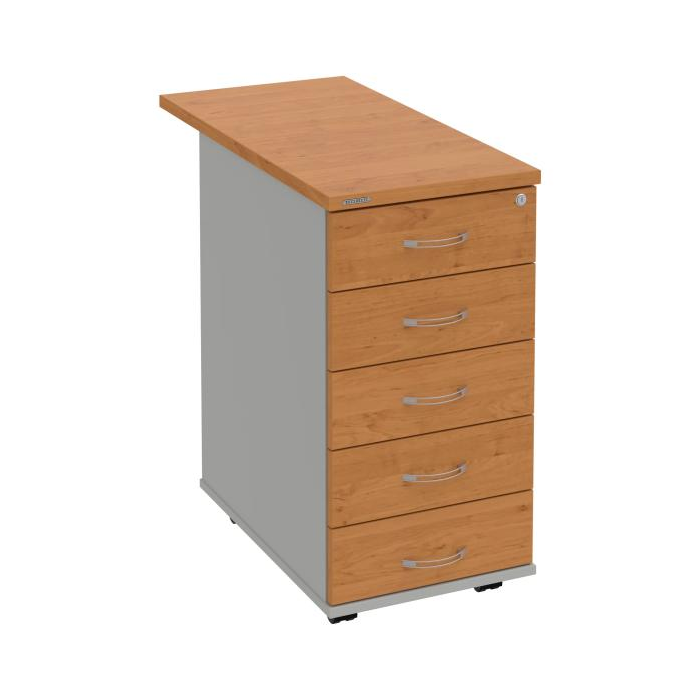 Kontajnery - všetko uložené a vždy poruke. Kontajnery sa väčšinou umiestňujú pod stoly. Mobilné modely sú vybavené kolieskami, je možné ich premiestniť podľa potreby. Základným materiálom korpusov je kvalitná laminovaná drevotriesková doska hrúbky 18 mm. Pre dlhšiu životnosť je na horný diel korpusu použitá doska, ktorej hrúbka je 25 mm. Korpusy a čelá zásuviek sú chránené proti poškodeniu hranou ABS 2 mm. Horná doska ma hĺbku 80 cm. Kontajnery sú vybavené zámkom s centrálnym zamykaním. Vďaka integrovanému systému STOP-CONTROL s centrálnym zámkom u väčšiny kontajnerov sa nemusíte báť prevrhnutiu kontajnera alebo prípadného privretia ruky. Systém zaručí, že pri otvorení jednej zásuvky sa ostatné zásuvky automaticky zablokujú. Zásuvky sú z plastu, ktorý je ľahko umývateľný a vhodný pre jednoduchú údržbu. Praktickou súčasťou vrchnej zásuvky je prehľadný organizér a priestorové deliace priečky. Vaše ceruzky, sponky a ďalšie kancelárske potreby budú vždy na poriadku. Organizér a deliace priečky sú súčasťou každého kontajnera. Na kontajnery Hobis sa vzťahuje päťročná záruka.