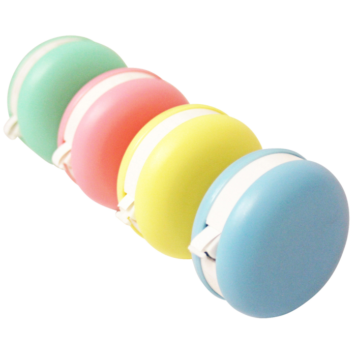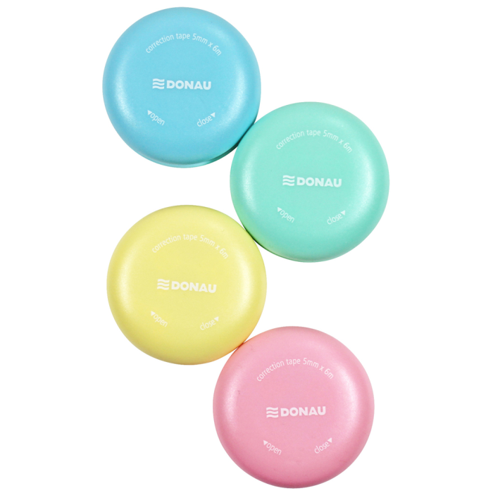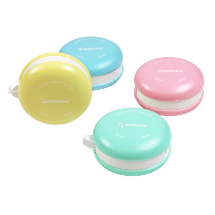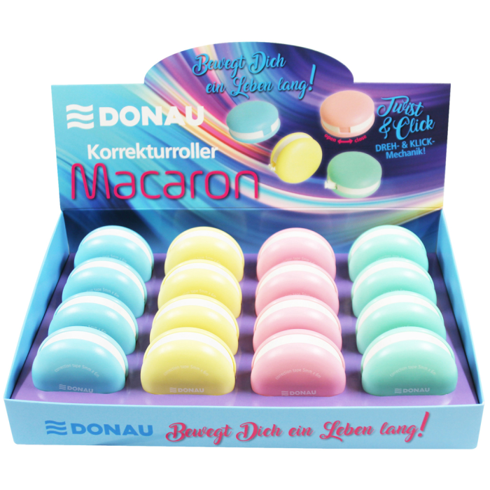 Korekčný roller v tvare makrónky, 16 ks na displeji, 4 rôzne farby tela, priemer 5 cm, dĺžka pásky 6 m, šírka pásky 5 mm, otváranie a zatváranie pomocou mechanizmu twist & click.
