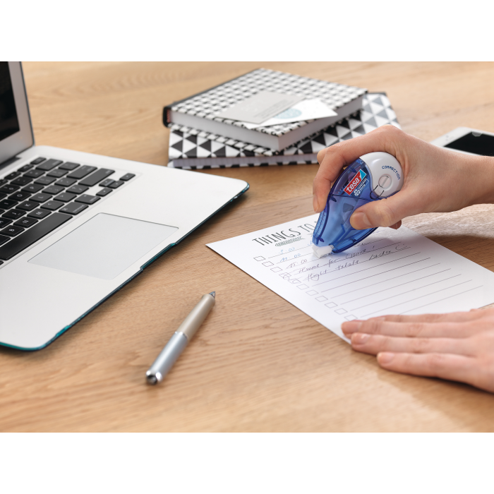 Praktický roller v ergonomickom tvare s jednoduchým použitím na presné opravy s výstužou z PET proti pretrhnutiu. Farba dokonale kryje a okamžite priľne k podkladu. Po nanesení sa dá okamžite popisovať. Telo rollera vyrobené zo 100% recyklovaných plastov, náplň zo 61 % recyklovaných plastov. Neobsahuje rozpúšťadlá. Väčšie balenie 5 ks. Šírka stopy 8,4 mm. Návin 14 m.