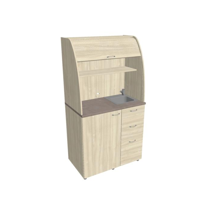 • Dve police vo vrchnej časti kuchynky poskytujú dostatočnú kapacitu na poháre, šálky a taniere. Na pracovnú dosku môžete umiestniť napr. kávovar a káblovou priechodkou v zadnej časti vyvediete kábel z priestoru kuchynky.