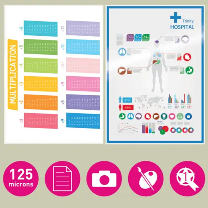 - Dlhodobá ochrana dokumentu pred nečistotou, tekutinou a vlhkosťou. Štandardná tuhosť laminácie.