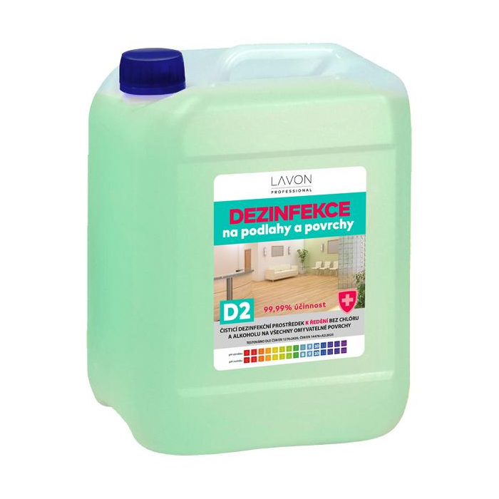 Dezinfekčný prostriedok LAVON na podlahy a povrchy D2 je biocídny čistiaci prípravok s vysokou penivosťou do potravinárstva, priemyslu, domácností a verejných priestorov. Určený na dezinfekciu a čistenie všetkých druhov podláh a nenasiakavých povrchov. Vysoká čistiaca a odmasťovacia účinnosť, vhodný aj na umývanie riadu. Likviduje baktérie a obalené vírusy: OTESTOVANÉ podľa STN EN 1276:2020, STN EN 14476+A2:2020.