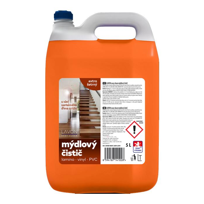 LAVON mydlový čistič  je účinný prostriedok s obsahom mydla na dokonalé čistenie bez šmúh. Je vhodný na podlahy a umývateľné povrchy: lamino, vinyl, PVC, linoleum, dlažba, mramor...a pod. Jemná vôňa santalového dreva a ruže príjemne prevonia všetky priestory.