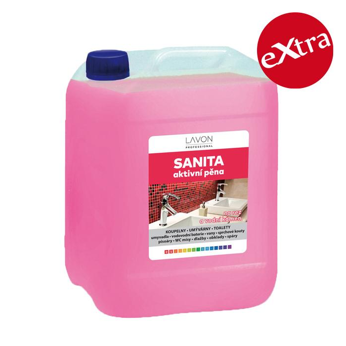 Lavon sanita aktívna pena je vysoko účinný prostriedok s obsahom kyseliny metansulfónovej a mliečnej, ktoré sú 100 % biologicky odbúrateľné a šetrné k povrchom. Na odstránenie vodného kameňa, zvyškov mydla, hrdze, minerálnych a močových usadenín, vápenných nánosov, prípadne cementových zvyškov. Pri pravidelnom použití oživuje povrchy a zabraňuje ich opätovnému znečisteniu. Hustá pena spoľahlivo priľne na horšie dostupných miestach a predlžuje čas pôsobenia. Na čistotu, lesk a ochranu povrchov nielen v kúpeľniach. Prípravok je možné použiť na umývadlá, vodovodné batérie, vane, sprchové kúty, zásteny, pisoáre, WC misy, dlažby, keramické obklady, škáry; je vhodný aj na postavebné upratovanie.