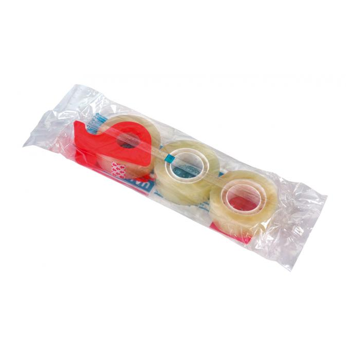 Univerzálna lepiaca páska vhodná do kancelárie, školy i na domáce využitie. Vyrobená z polypropylénu, odolnému voči žltnutiu. Vysoko transparentná, pri faxovaní a kópiách ich nevidieť. Silná substancia lepidla zaručuje dlhú trvanlivosť. Dodávaná v balení 3 ks s dispenzorom.