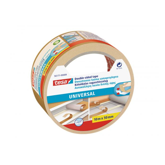 Univerzálna obojstranná páska ideálna na koberce a trvalé spojenie rôznych materiálov, na ručné práce a dekorácie. Rozmery 50 mm × 10 m.