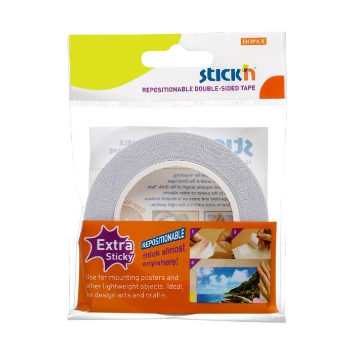 Obojstranná samolepiaca páska Stick‘n by Hopax so silnou lepivosťou pri pripevňovaní dekorácií, plagátov, fotografií alebo iných ľahkých papierových predmetov. Veľmi ľahká aplikácia aj bez nožníc. Vďaka pílovitému okraju ju možno ľahko a úhľadne odtrhnúť rukou. Po nalepení môžete pásku jednoducho odlepiť a znovu použiť. Po odlepení nezanecháva na povrchu žiadne stopy po lepidle. Farba biela. Rozmery 25 mm x 12 m.